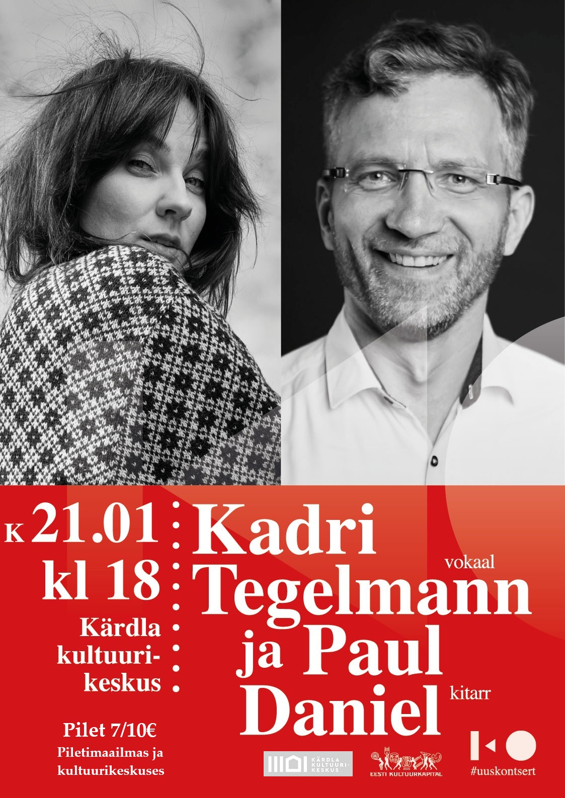 21. jaanuaril kell 18 Kadri Tegelamann ja Paul Daniel. Piletid 7/10€ Piletimaailmas ja kultuurikeskuses