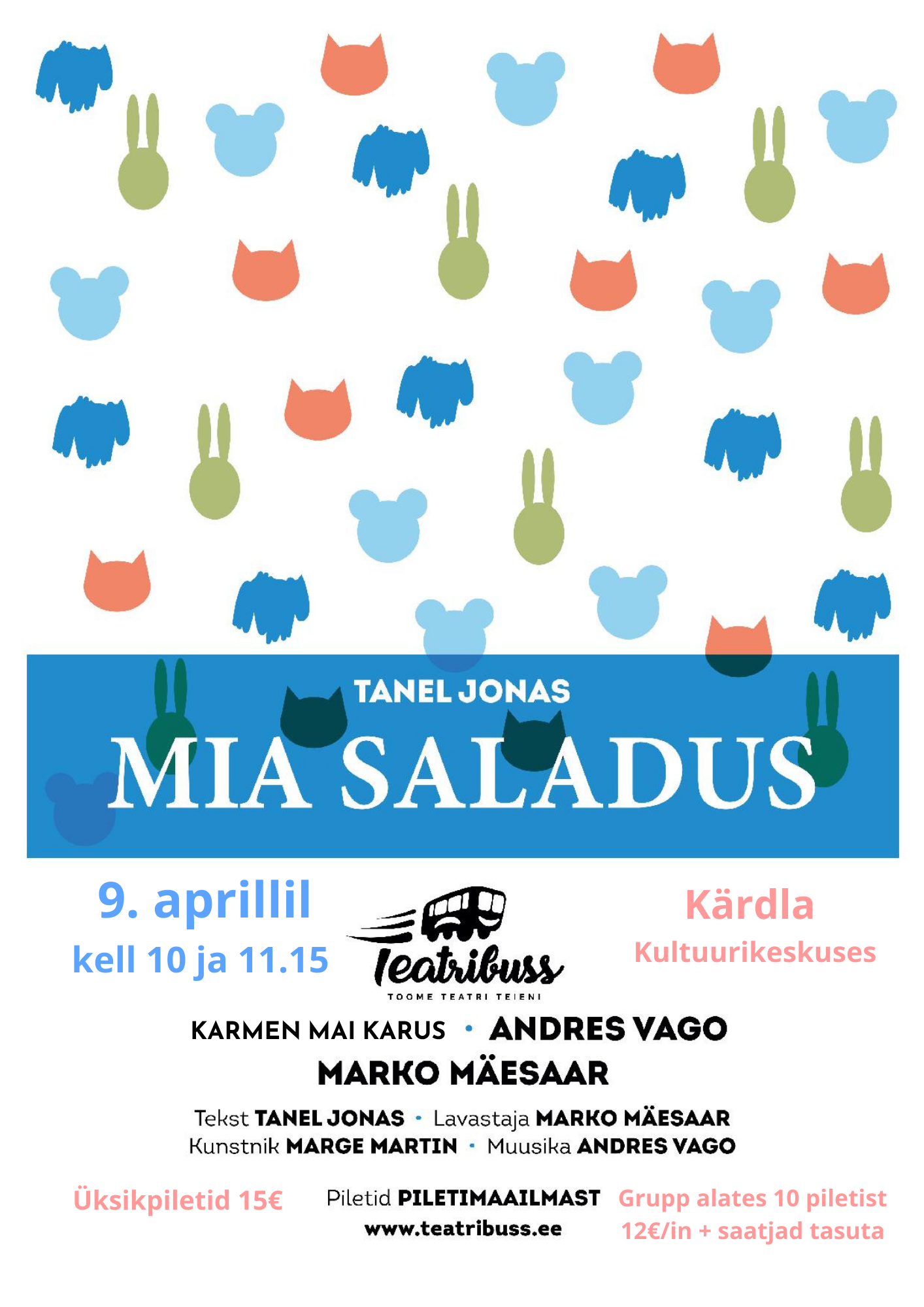 Üksikpilet 15€, grupp 10 last 12€+saatjad tasuta eelmüügis piletimaailm.com või kultuurikeskuses.